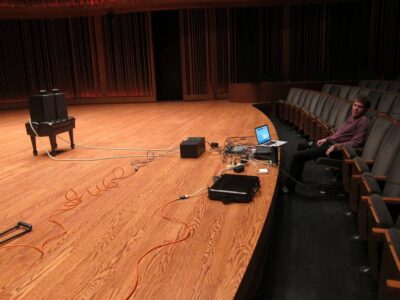 The small concert hall in the guitar encouraged me to seek out a large concert hall to mix the album in. The Macalaster College music department kindly let me bivouac in their concert hall for an evening. I set up two pairs of mics: one in the center of the hall, and one pair in back. It worked well to allow a room’s ambience to settle around the piano and percussion. The natural acoustics of the hall helped the guitar settle into the piano.